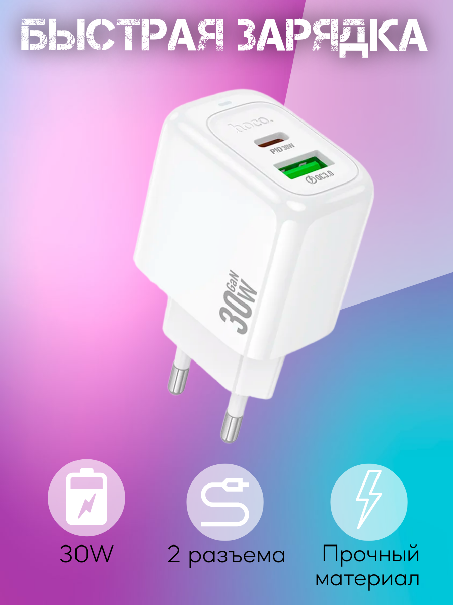 2. Мощность: Type-C: 30 Вт (PD / QC / FCP / AFC); USB-A: 18 Вт (QC / FCP / AFC); Type-C + USB-A= 5 В / 3 А